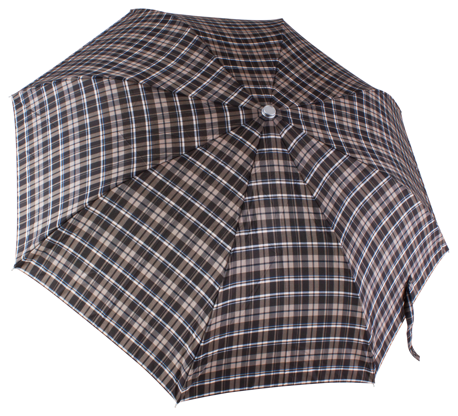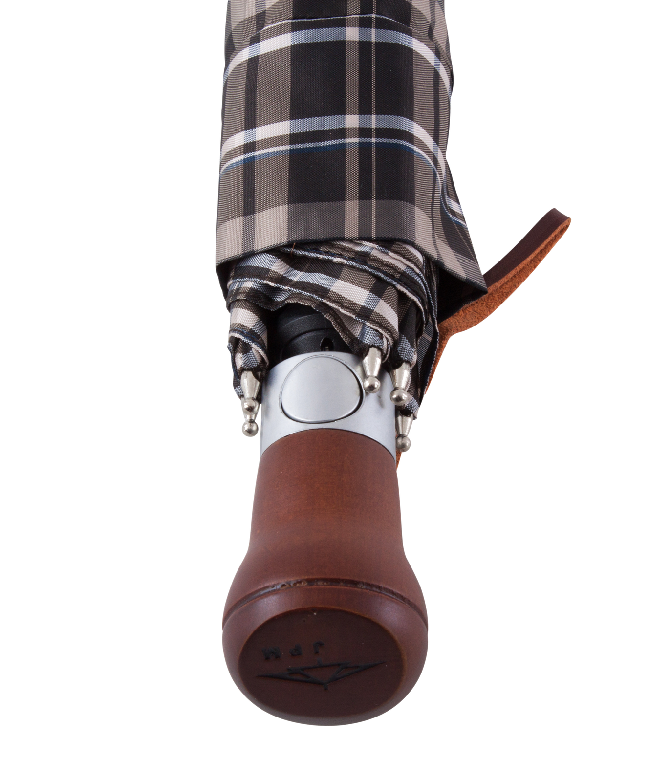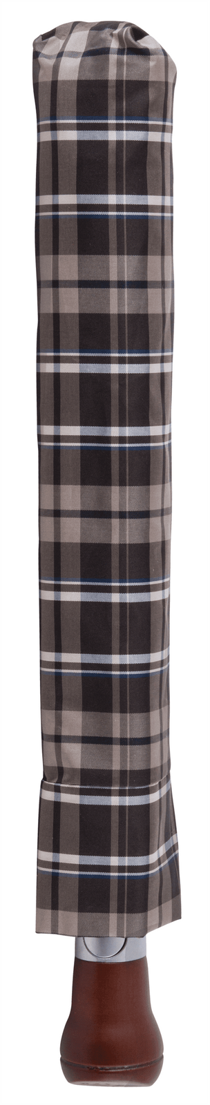 - Parasol otwierany automatycznie, z okrągłą drewnianą rączką i wzorzystym pokryciem z poliestru.
