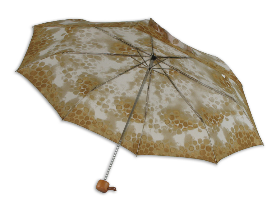 • Klasyczny parasol otwierany manualnie, z drewnianą okrągłą rączką i wzorzystymi pokryciami wykonanymi z poliestru.