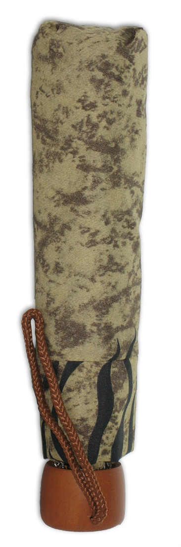 - Klasyczny parasol otwierany manualnie, z drewnianą okrągłą rączką i wzorzystymi pokryciami wykonanymi z poliestru.