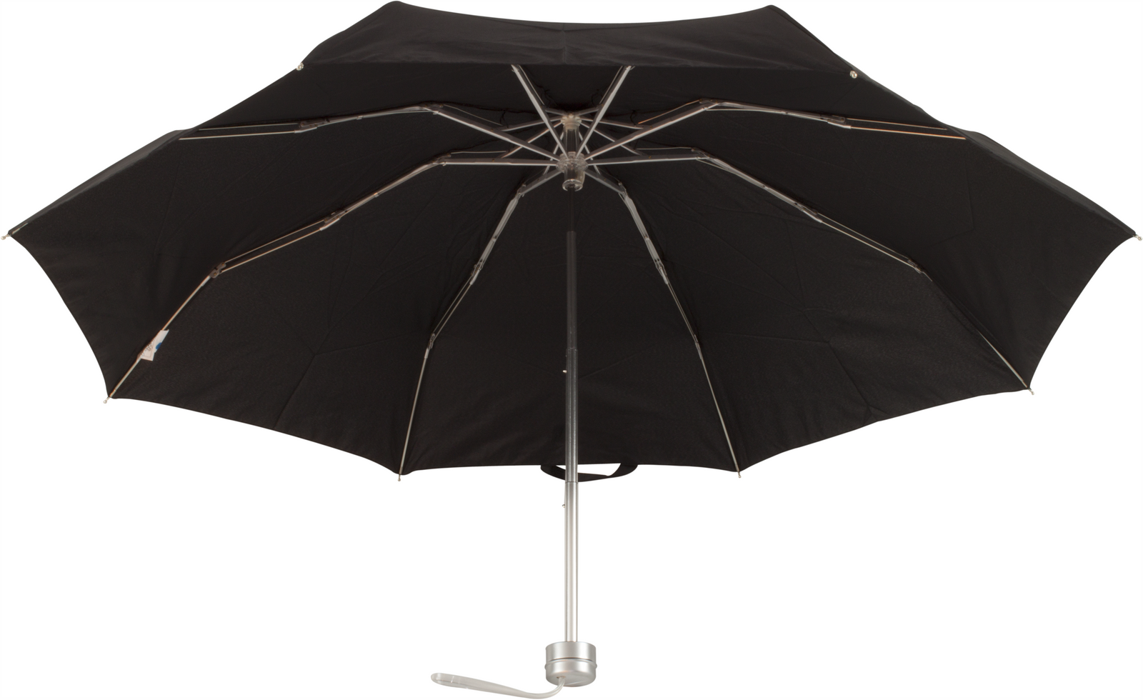 - Mały podręczny parasol z czarnym pokryciem i szkieletem wykonanym z części aluminiowych i włókna szklanego. Parasol otwierany ręcznie, z wygodną plastikową rączką w kolorze srebrnym.
