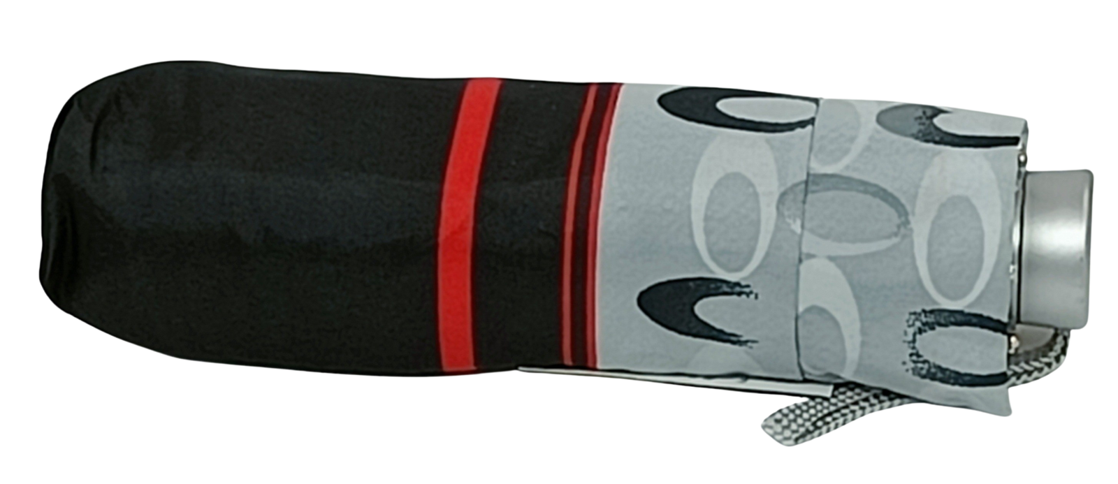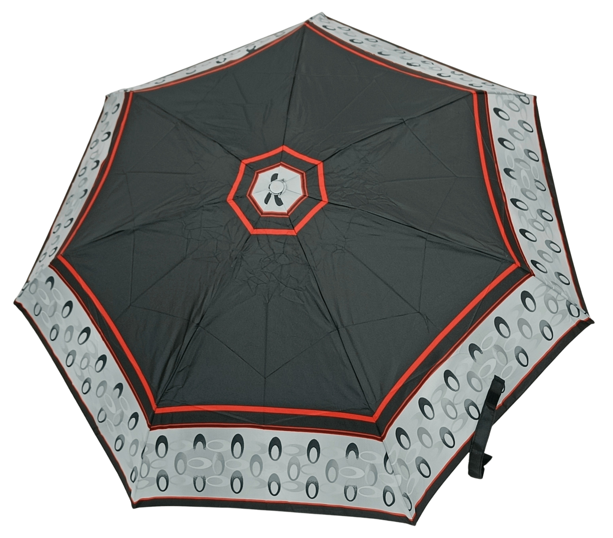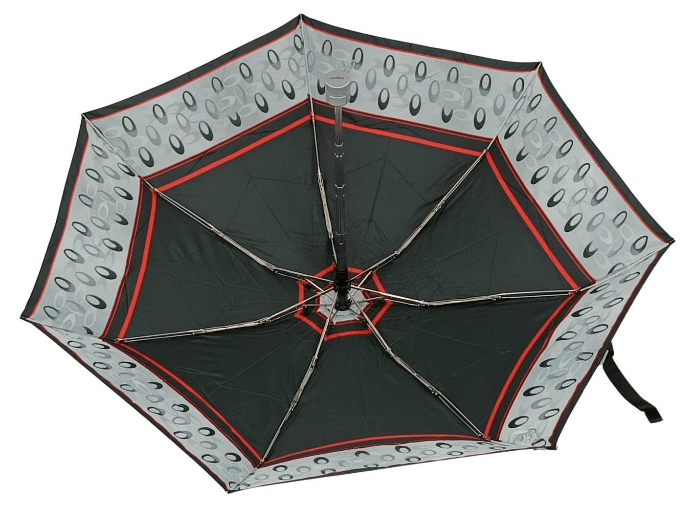 - Parasol otwierany automatycznie, z okrągłą srebrną plastikową rączką i wzorzystym pokryciem z poliestru.