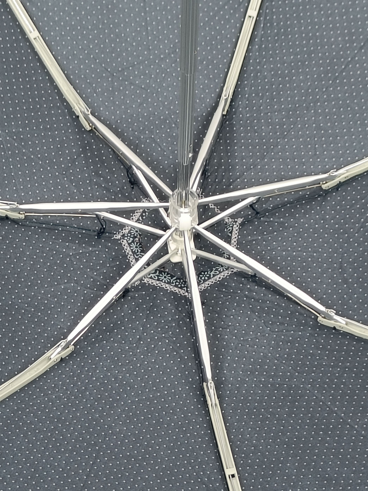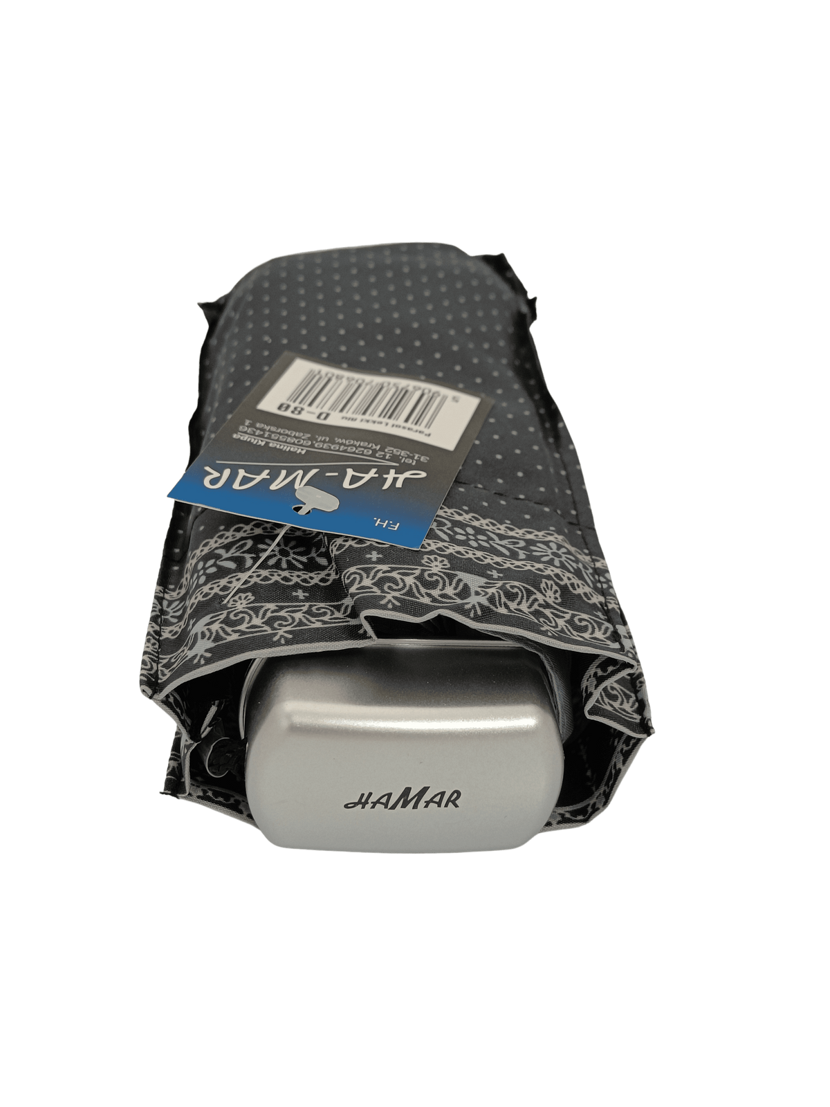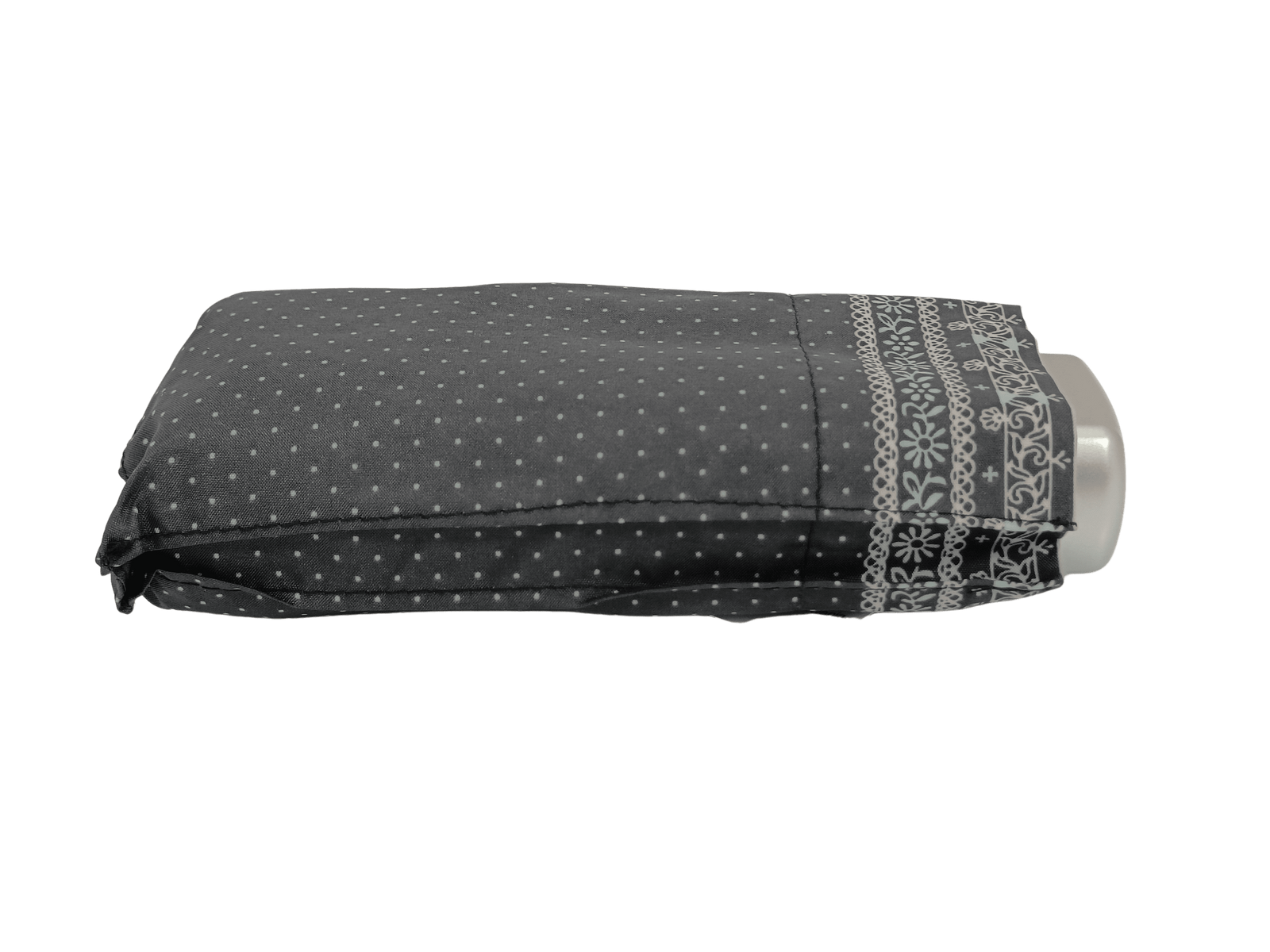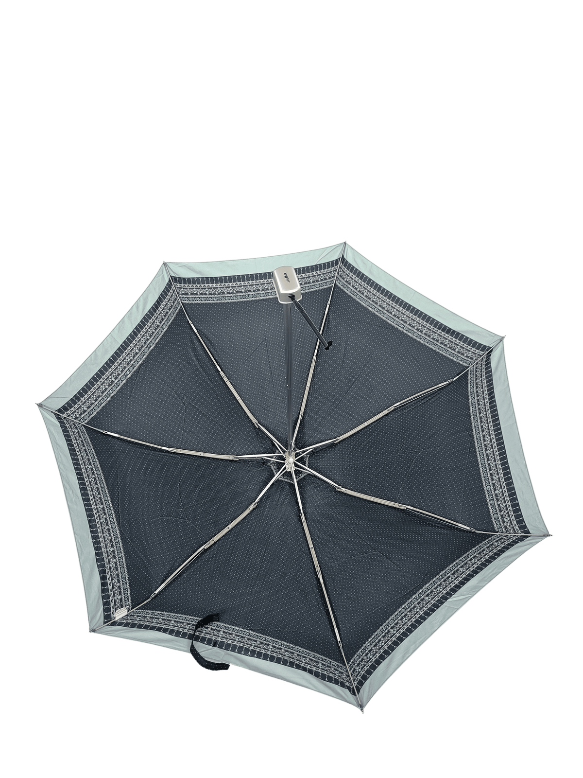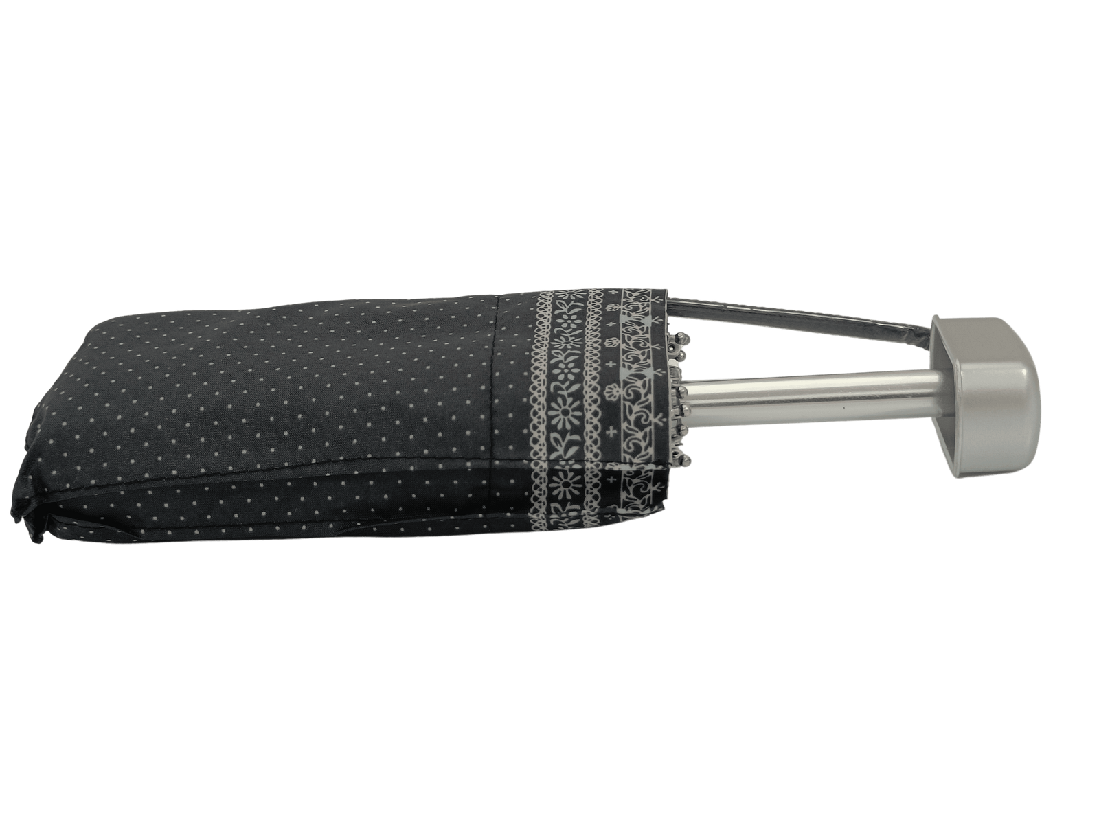 • Lekki i mały parasol otwierany ręcznie, z plastikową prostokątną rączką w kolorze srebrnym i pokryciem wzorzystym z poliestru.