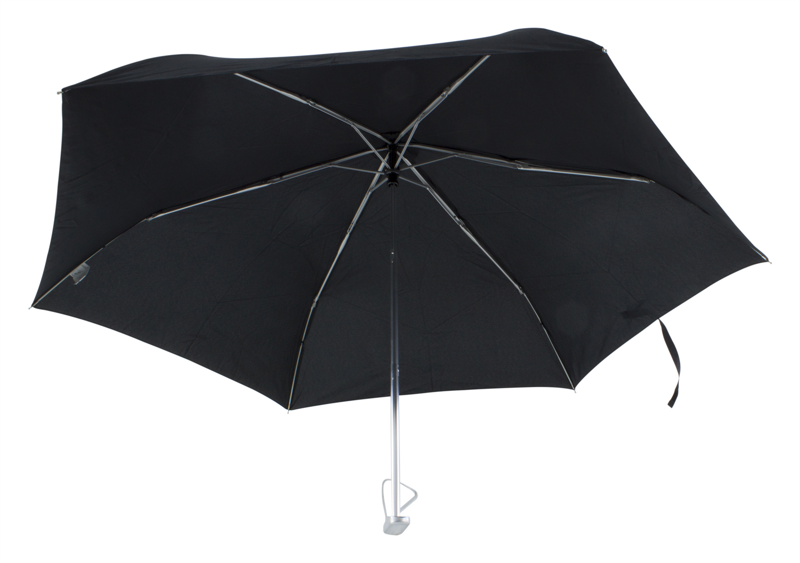 • Mały i podręczny parasol z czarnym pokryciem i szkieletem wykonanym z aluminium i elementami z włókna szklanego. Parasol z komfortową plastikową rączką w kolorze srebrnym.
